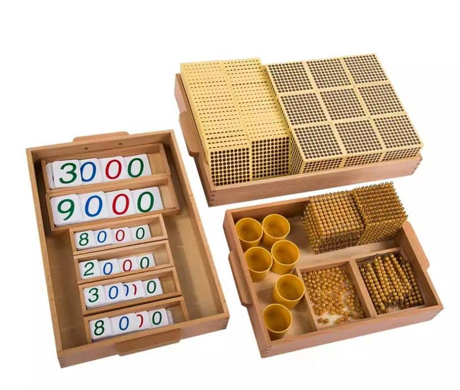 La banque complète Montessori avec symboles introduit les quatre opérations et le système décimal grâce aux perles Montessori.